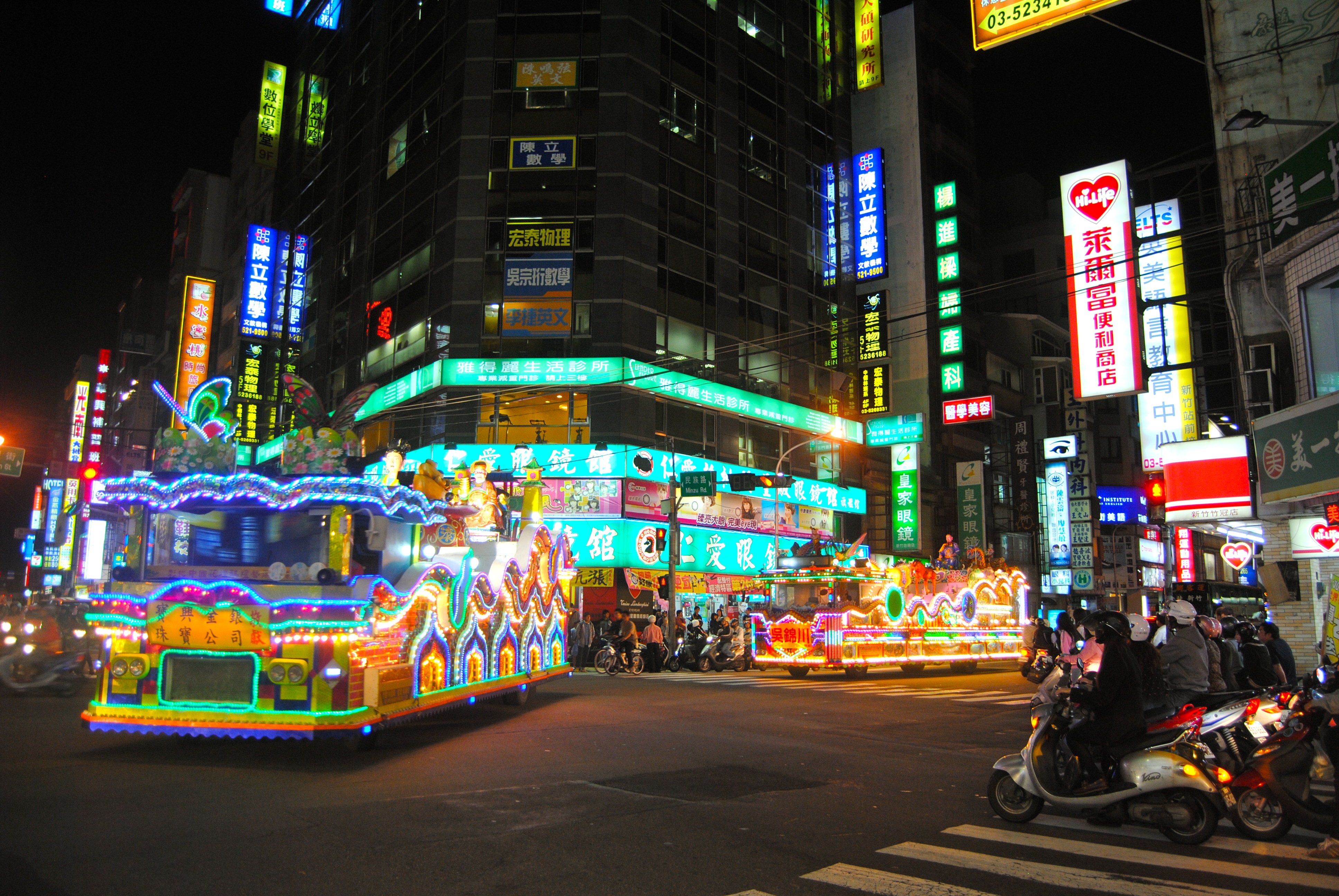 Came across a spontaneous parade of giant flashing lights on my way home from work today. No one was paying much attention, but they had police guiding their way though downtown Hsinchu so I guess it was legit. Very cool Taiwanese style dragon decorations and Buddha statues… the only odd thing was that at least 3 of the floats were blasting ‘Like a G6’. Guess the Far East Movement has finally found its way from the East Gate to Minzu Rd.