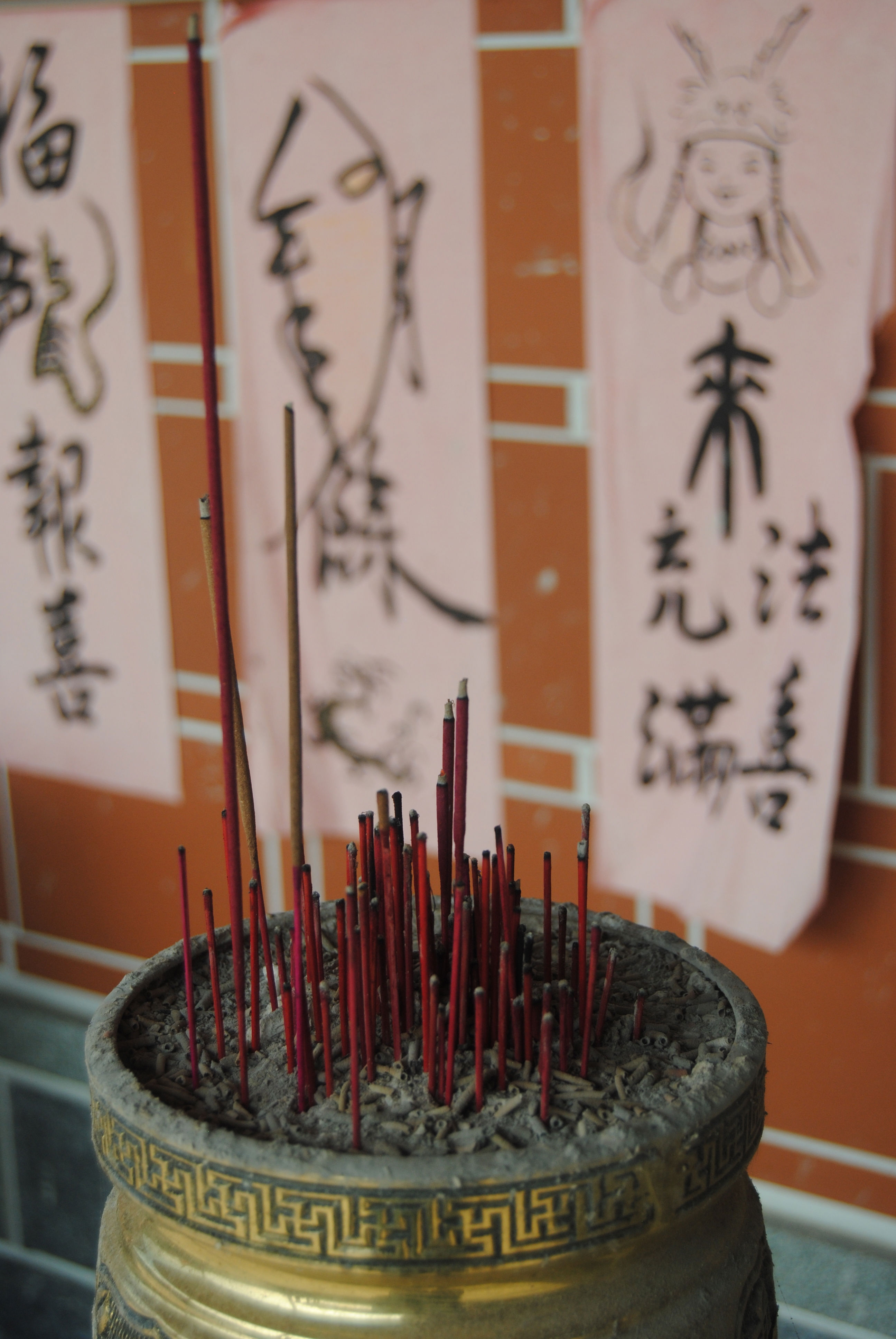 The incense sticks, the calligraphy, and the colors come together to provide a snapshot of everyday living in Taiwan.