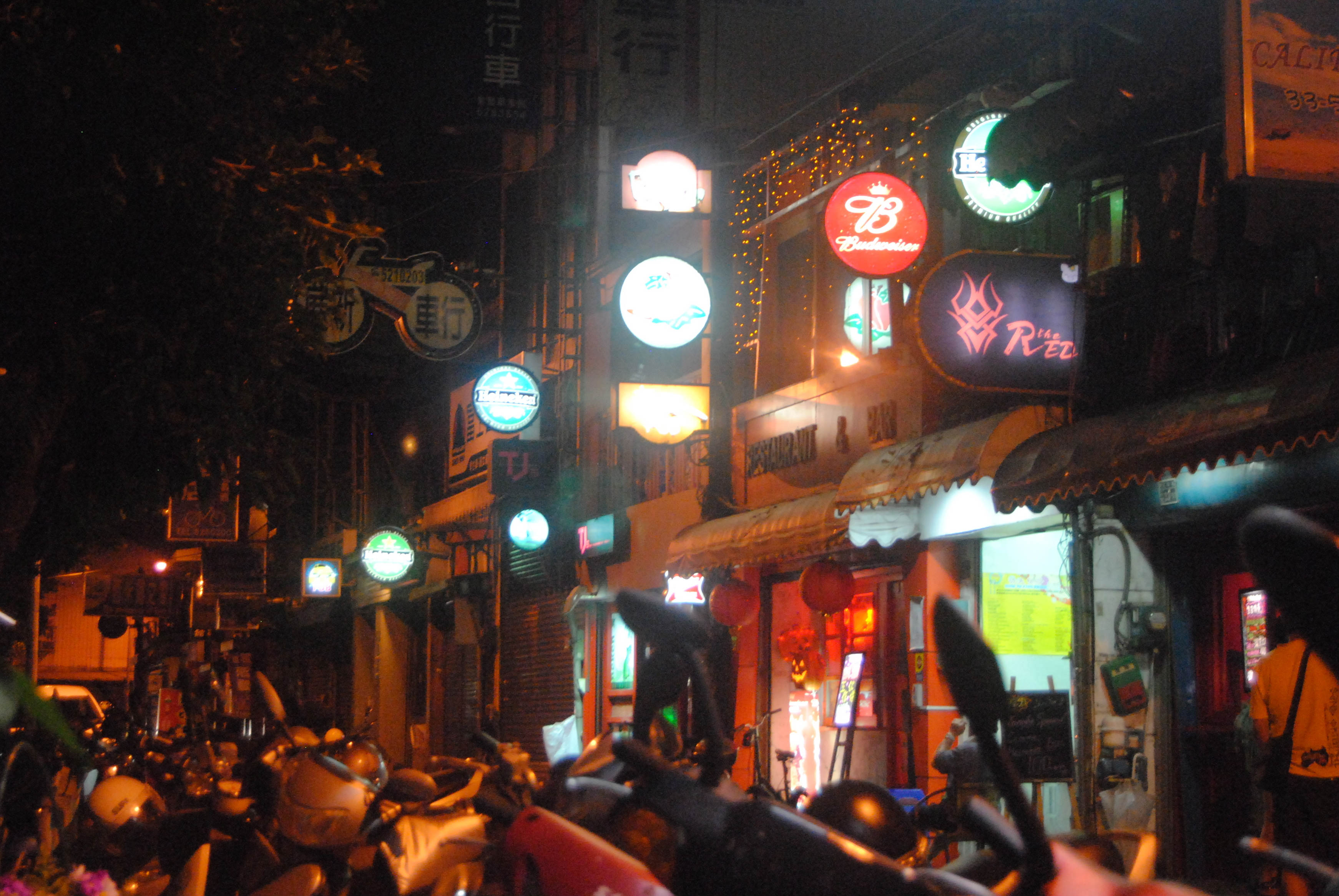 A typical Taiwanese street, lined with scooters and bright lights. This is one of our few bar streets in Hsinchu. We frequent the Red probably more than we should…