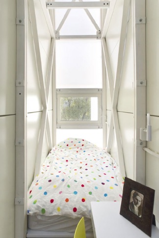 The Keret House is an iron structure in Warsaw, Poland, designed by the architect Jakub Szczęsny. The two-story art installation has a bedroom, a kitchen, a bathroom and a living area and takes the name of its first tenant, the writer and Israeli film director Etgar Keret. It has two windows that do not open, while the sunlight also penetrates translucent glass panels that make up the walls, and the entire interior is painted white. The building classified as an “art installation” by the City Hall of Warsaw, measures 92 centimeters at its narrowest point and 152 centimeters at its widest point and is, in fact, the most stringent house in the world.